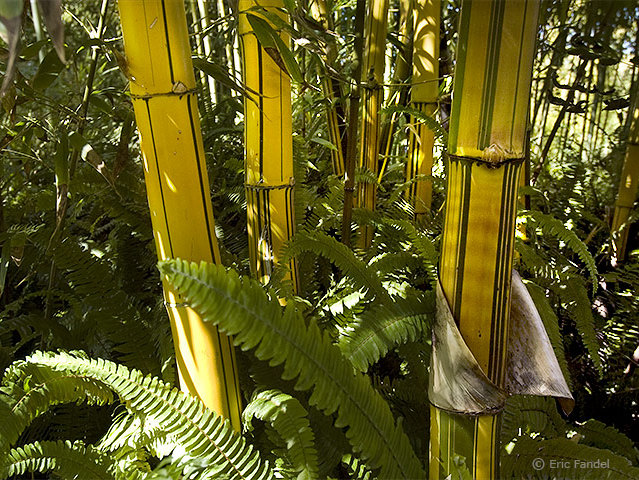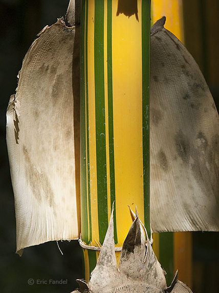 Aussehen: Besonders markant sind die mit der Zufälligkeit der Natur gestreiften Halme. Einige sind hellgelb und mit schmalen oder auch mal mit breiten grünen Streifen versehen. Manchmal sind die Halme auch hellgrün mit gelben Streifen. Dies variiert von Halm zu Halm innerhalb einer Pflanze. Der Durchmesser eines Halms beträgt 5-12 cm. Das Laub wächst schmal und lanzenförmig.